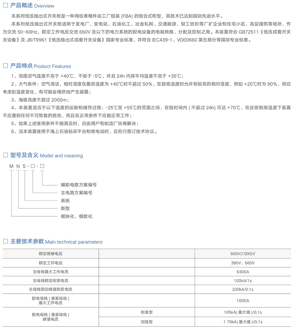 本系列低压抽出式开关柜适用于发电厂、变电站、石油化工、冶金轧钢、交通能源、轻工纺织等厂矿企业和住宅小区、高层建筑等场所、作 为交流 50~60Hz,额定工作电压交流 660V 及以下的电力系统的配电设备的电能转换、分配及控制之用。本装置符合 GB72511《低压成套开关 关设备》及 JB/T9961《低压抽出式成套开关设备》国家专业标准、并符合 IEC439-1、VDE0660 第五部分等国际专业标准。
