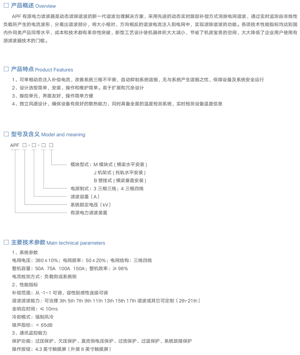 APF 有源电力滤波器是动态滤除谐波的新一代谐波治理解决方案,采用先进的动态实时跟踪补偿方式消除电网谐波,通过实时监测由非线性 负载所产生的电流波形,分离出谐波部分,将大小相对,方向相反的谐波电流注入到电网中,实现滤除谐波的功能。各项技术性能指标均达到国 内外同类产品同等水平,成本和技术都有革命性突破,新型工艺设计使机器体积大大减小,节省了机房宝贵的空间,大大降低了企业用户使用有 源滤波器技术的门槛。