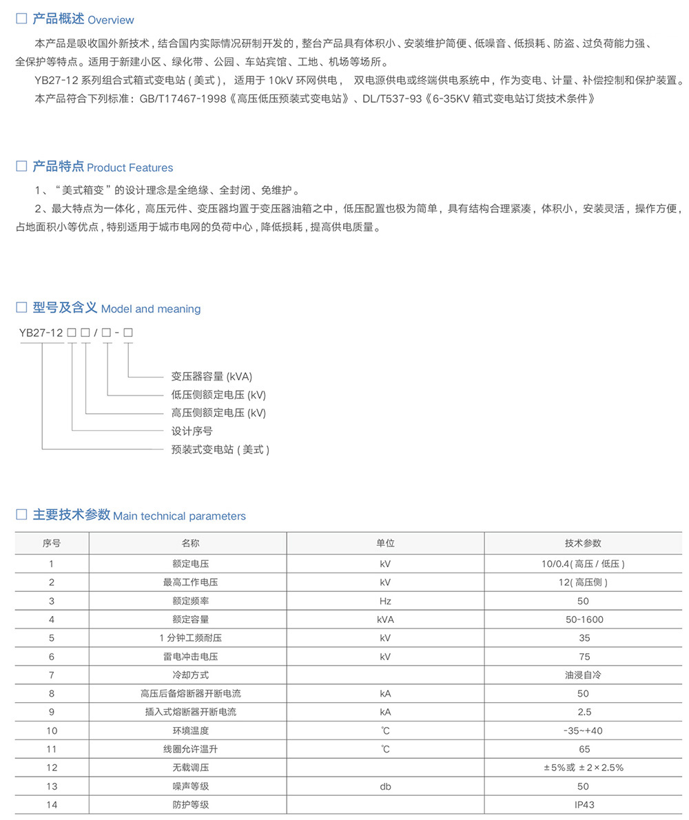 YB27-12 系列组合式箱式变电站 ( 美式 ), 适用于 10kV 环网供电, 双电源供电或终端供电系统中,作为变电、计量、补偿控制和保护装置。