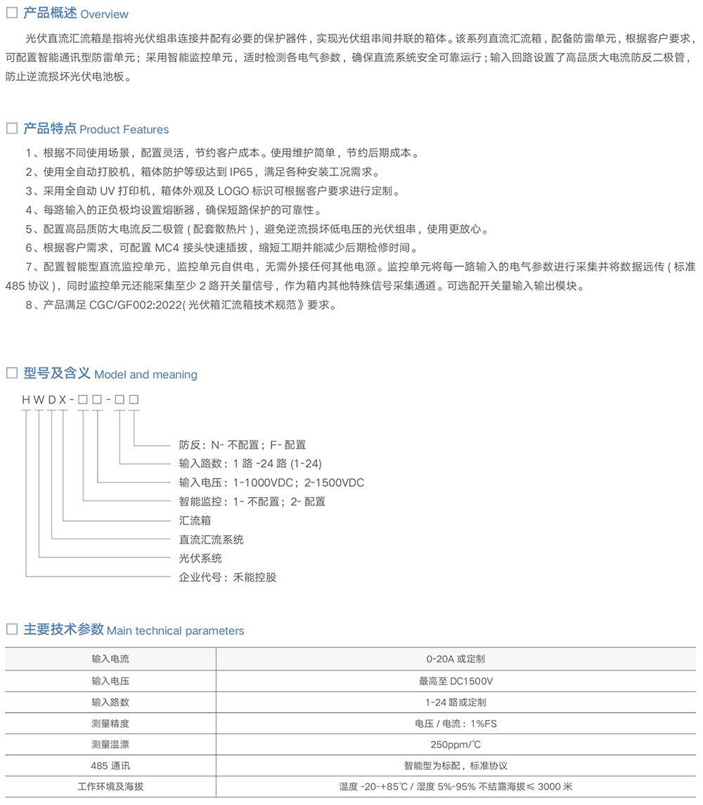 光伏直流汇流箱是指将光伏组串连接并配有必要的保护器件,实现光伏组串间并联的箱体。该系列直流汇流箱,配备防雷单元,根据客户要求, 可配置智能通讯型防雷单元;采用智能监控单元,适时检测各电气参数,确保直流系统安全可靠运行 ; 输入回路设置了高品质大电流防反二极管, 防止逆流损坏光伏电池板。