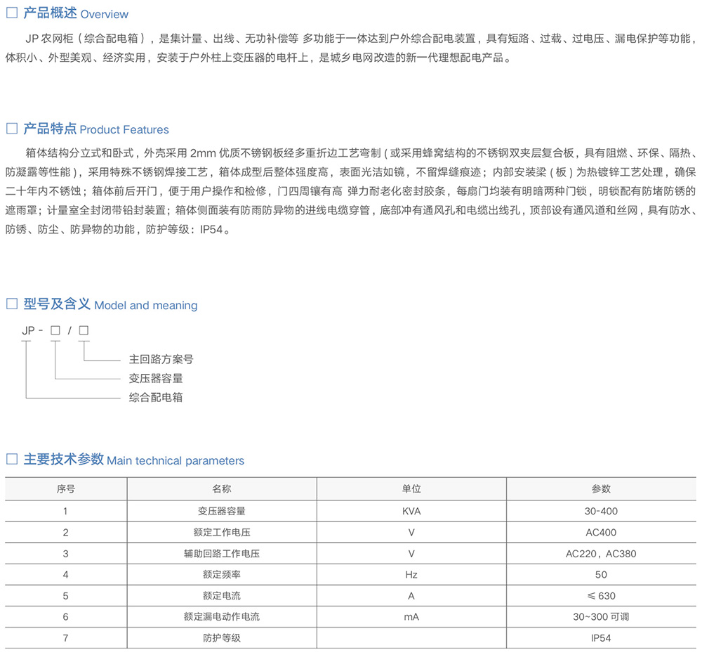 JP 农网柜(综合配电箱),是集计量、出线、无功补偿等 多功能于一体达到户外综合配电装置,具有短路、过载、过电压、漏电保护等功能, 体积小、外型美观、经济实用,安装于户外柱上变压器的电杆上,是城乡电网改造的新一代理想配电产品。