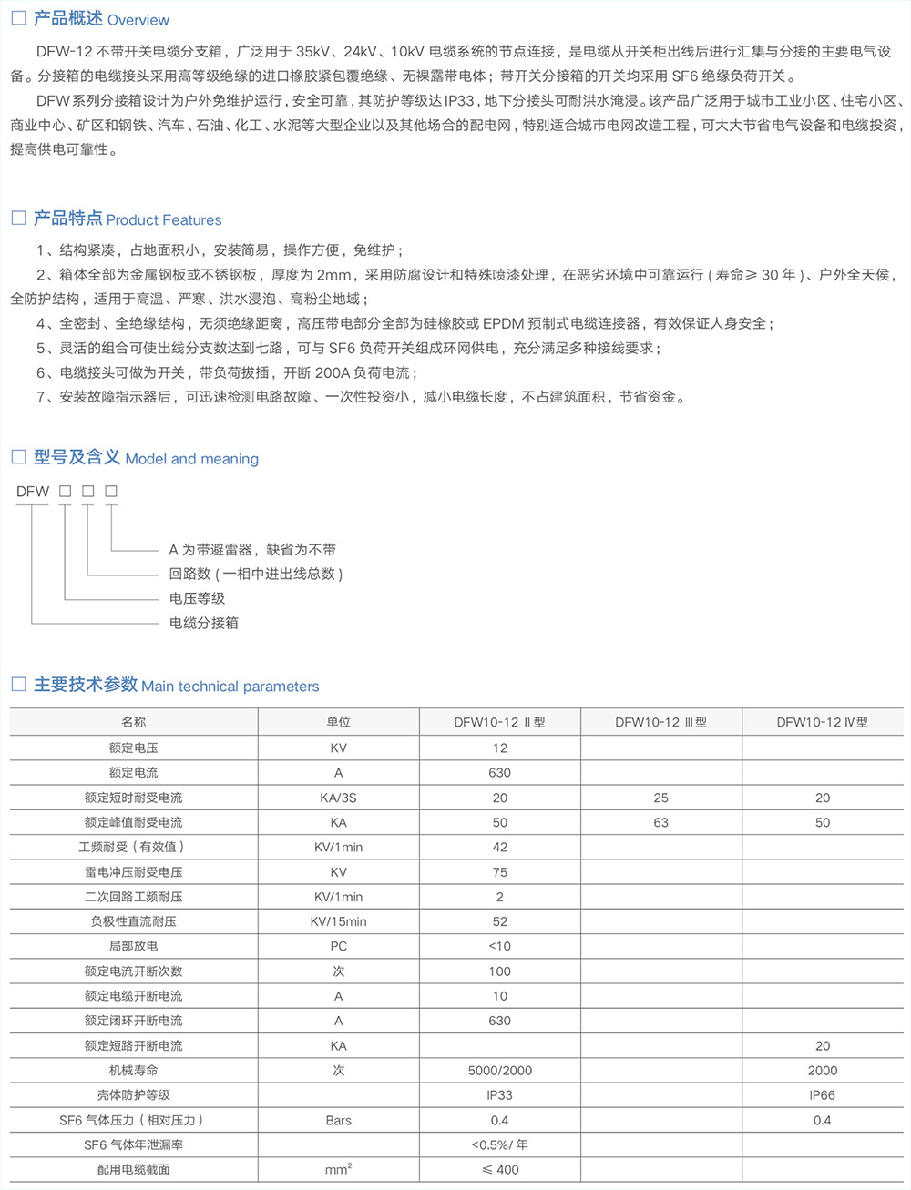 DFW 系列分接箱设计为户外免维护运行,安全可靠,其防护等级达 IP33,地下分接头可耐洪水淹浸。该产品广泛用于城市工业小区、住宅小区、 商业中心、矿区和钢铁、汽车、石油、化工、水泥等大型企业以及其他场合的配电网,特别适合城市电网改造工程,可大大节省电气设备和电缆投资 , 提高供电可靠性。