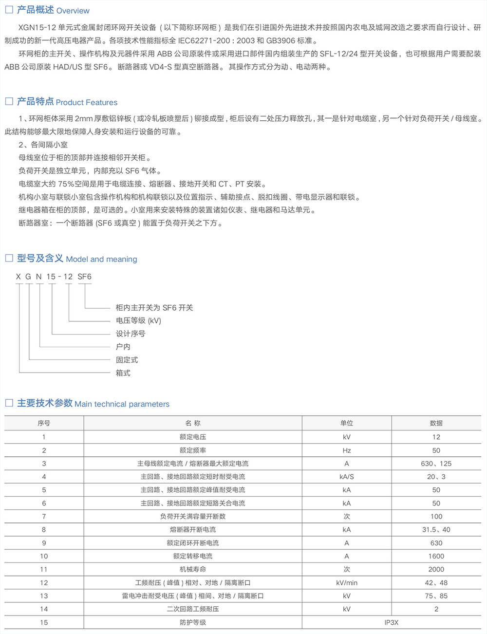 XGN15-12 单元式金属封闭环网开关设备 ( 以下简称环网柜 ) 是我们在引进国外技术并按照国内农电及城网改造之要求而自行设计、研 制成功的新一代高压电器产品。各项技术性能指标全 IEC62271-200 : 2003 和 GB3906 标准。
